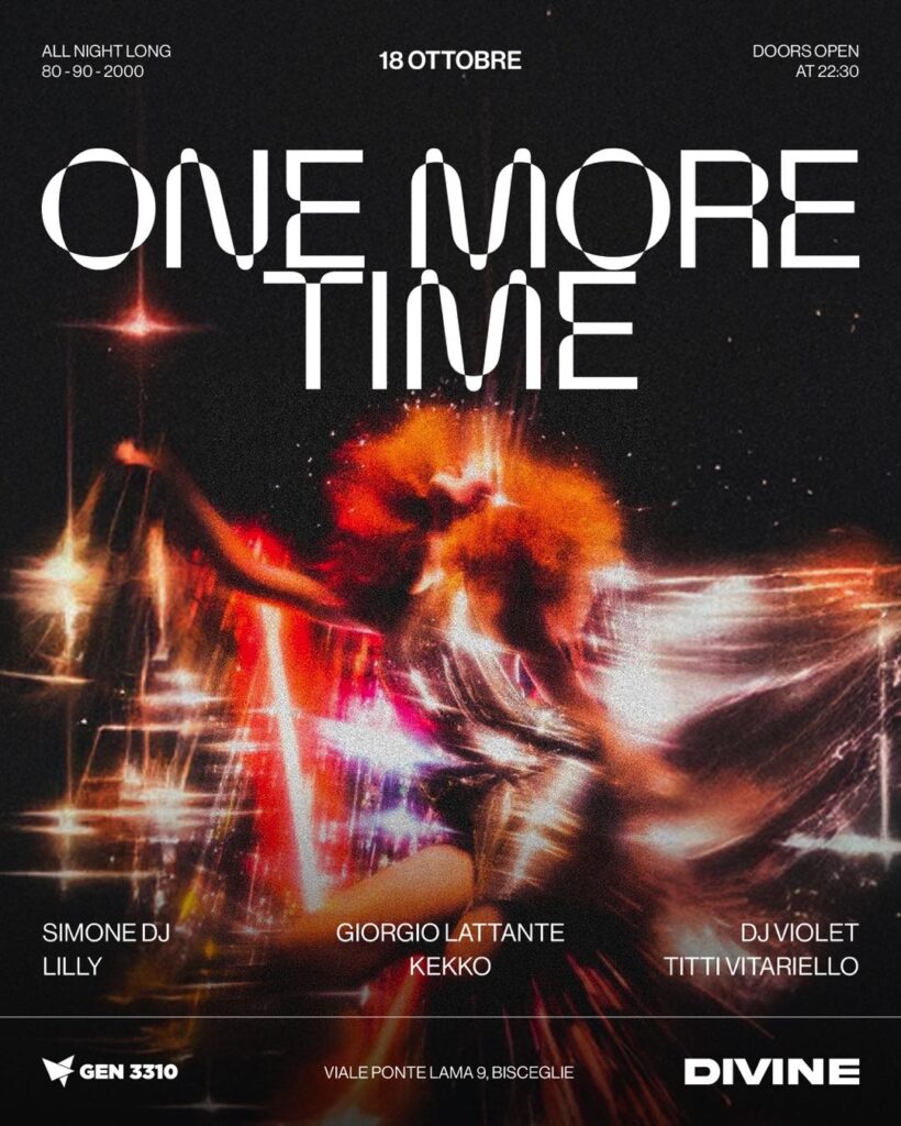 Sabato 18 ottobre al Divine Club. Un nuovo capitolo della notte, un ritorno carico di energia, ritmo e luce. In consolle, l’inconfondibile sound di DJ Violet, Simone Dj, Lilly, Giorgio Lattante e Titti Vitariello. È il momento di vivere One More Time